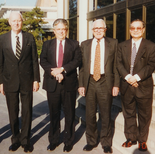 Founding members of the USCPF together in Beijing in March 1997. Pictured from far left: Amb. John Holdridge, Amb. Arthur Hummel, Jr., Amb. Charles W. Freeman, Jr., and Dr. Chi Wang.